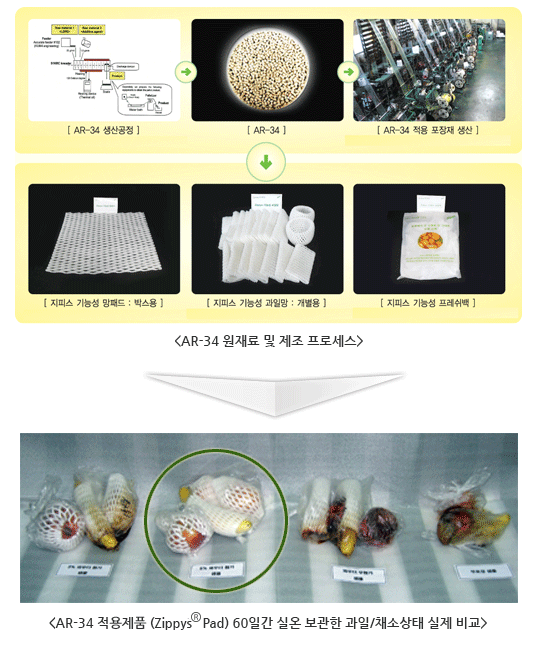 ㈜한그린테크와 서울대학교 및 국내‧외 연구기관의 공동 기초연구를 통해 독자적 특허 신기술로 개발된 능동포장재의 핵심소재는 바로 "多기능성 천연무기소재 복합폴리머, AR-34 (Anti-Rot 34)" 입니다.